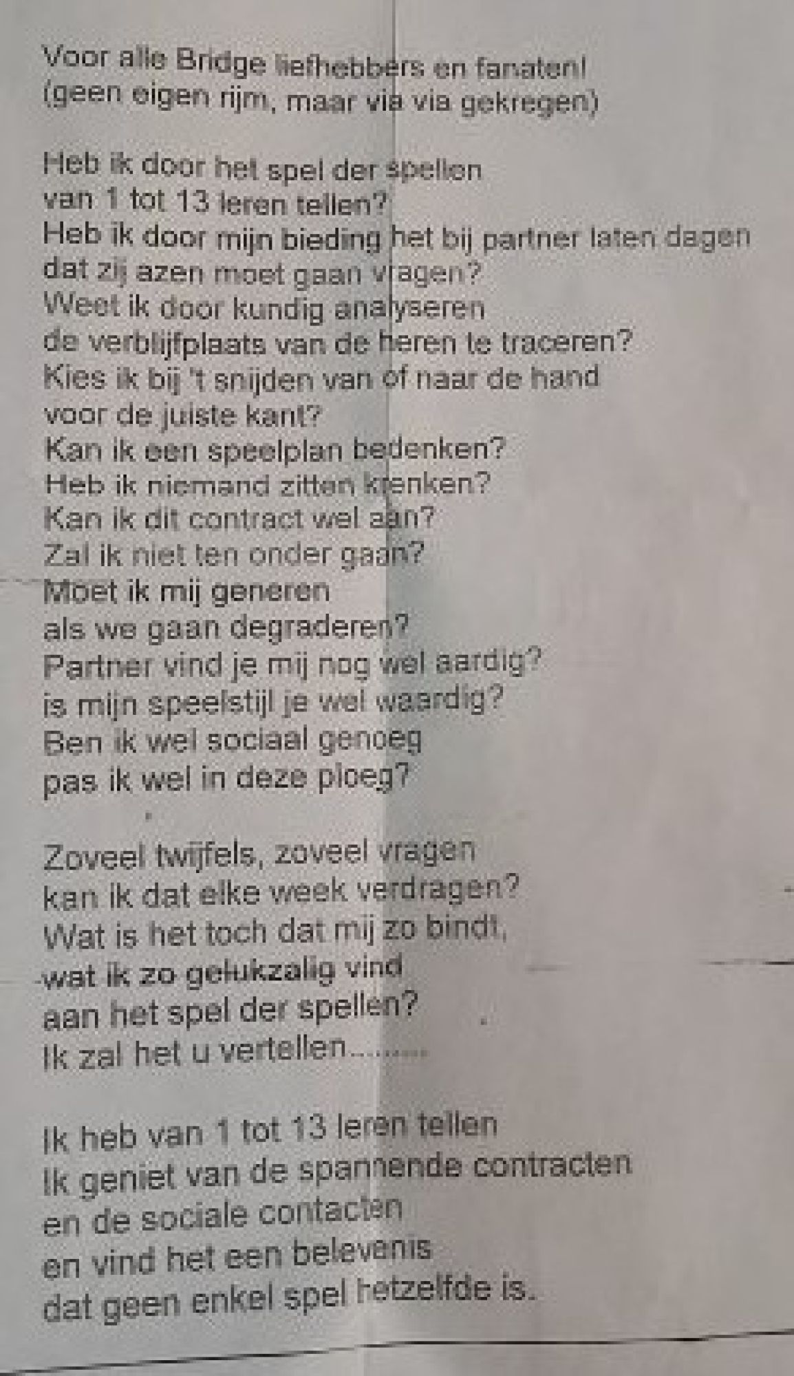 In de pauze halverwege de drive las Adri Hoogstrate een leuk bridgegedicht voor, Op de foto hiernaast kun je het nalezen door er op te klikken.