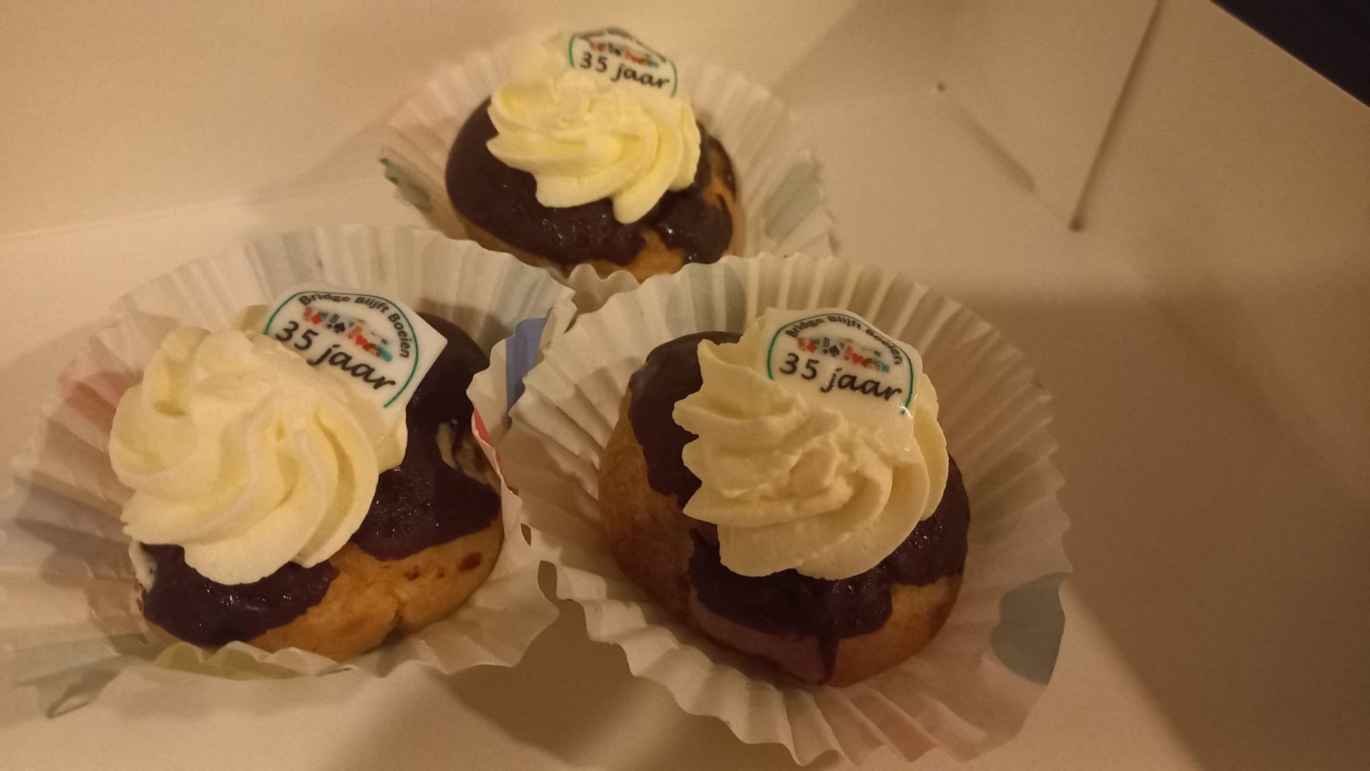 Daarna konden we ook nog even serieus spelen, wat zeker voor de nieuwelingen een stevige kennismaking was met het wedstrijdbridge. Een groot succes was dat 7 van de 8 cursisten van de bridgecursus meededen, natuurlijk een beetje geholpen door de andere spelers. Jan ontpopte zich ook als een meester soesjesbakker, met een mooi plaatje op ieder soesje ter gelegenheid van het 35 jarig bestaan van de club! Op de foto van het nieuwsbericht kun je zien hoe deze eruit zagen.