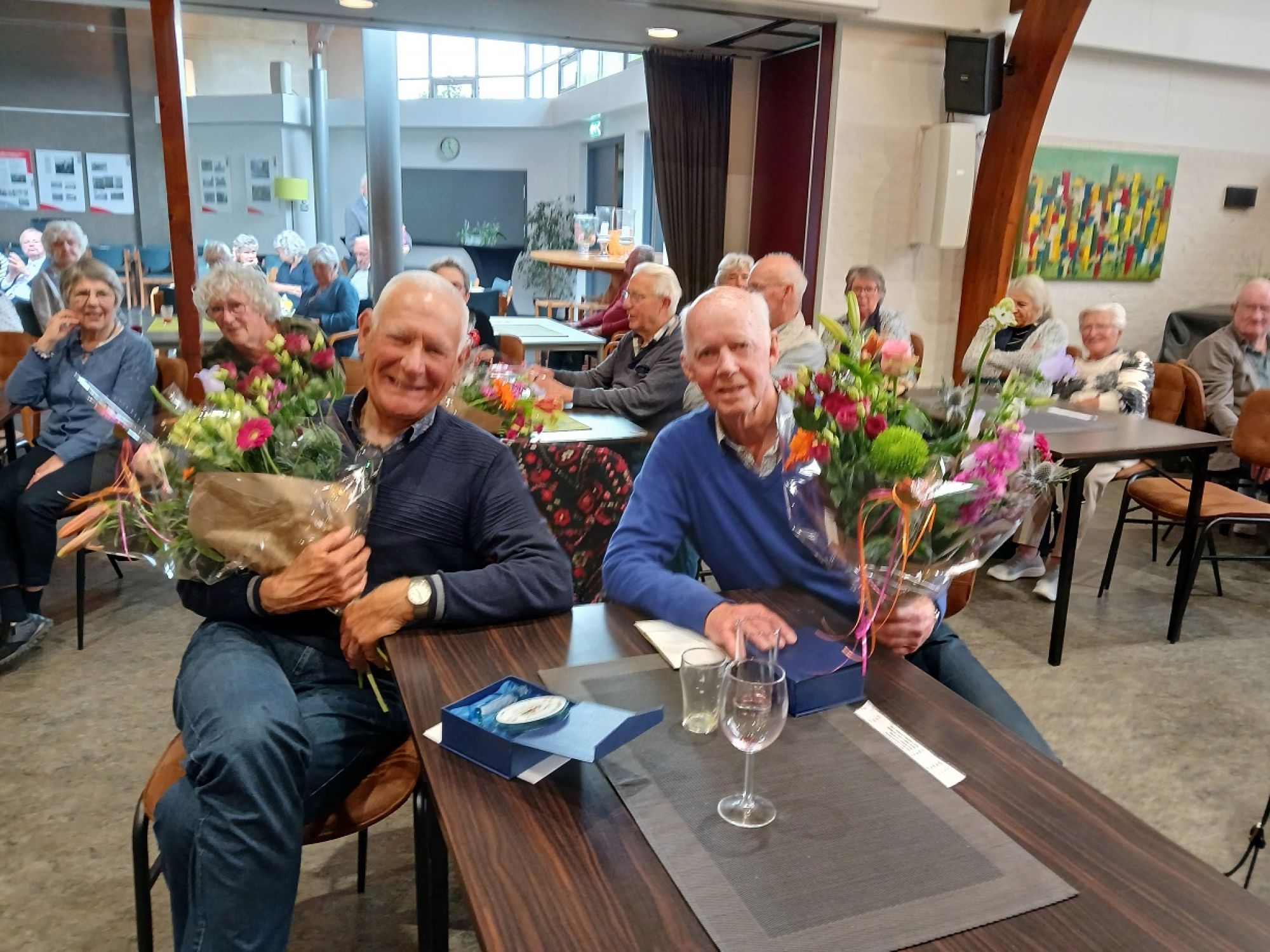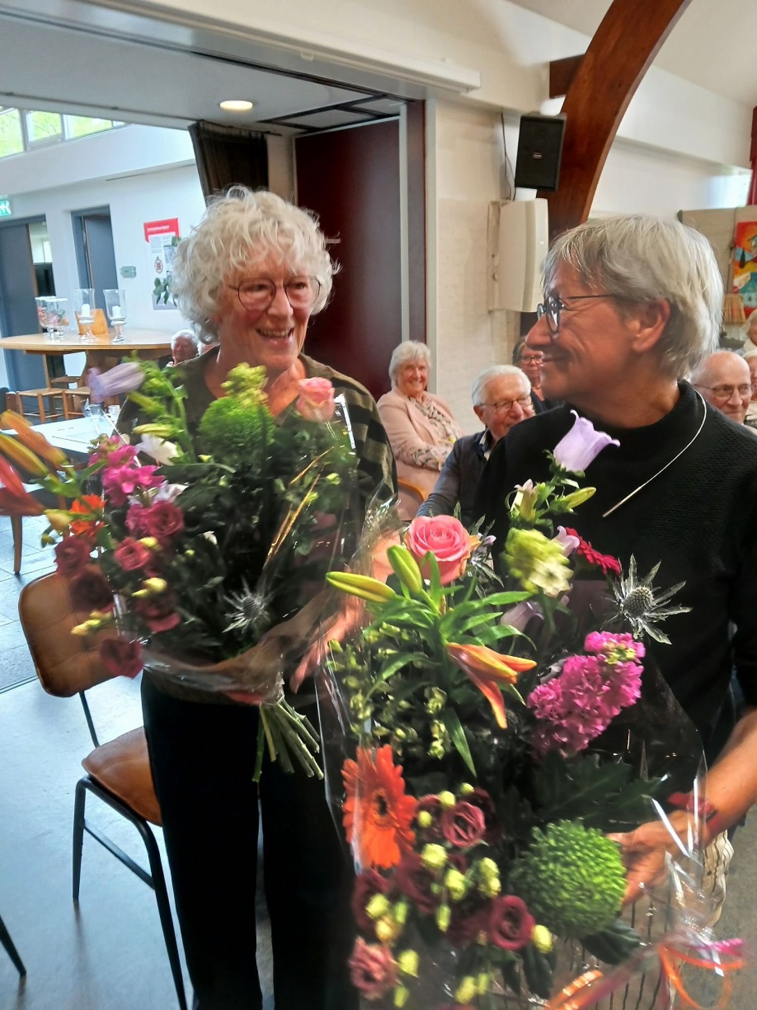 Lineke Stam en Francis Beltman mochten ook bloemen in ontvangst nemen als waarderng voor hun inzet bij de wekelijkse struggle voor een passende indeling van de bridgeparen. Hierbij komt met regelmaat nog een afzegging vlak voor het begin van de zitting en vind dan maar eens en passende oplossing.....