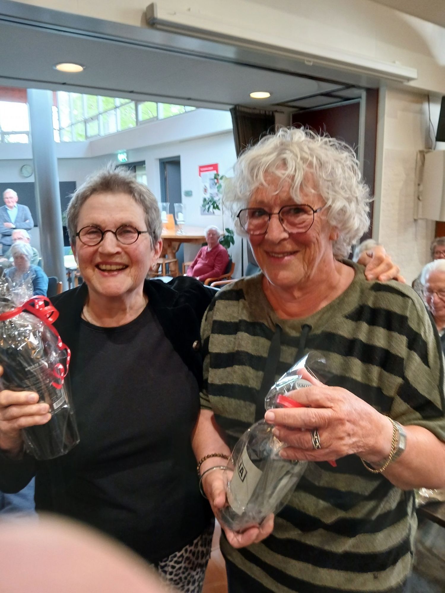 Vervolgens werden Mary Pagrach en Lineke Stam geprezen voor het beste slemseizoensresultaat met voor ieder een fles wijn als beloning.
